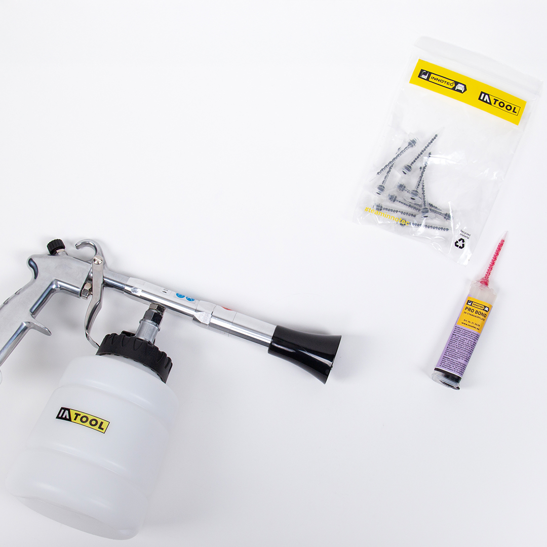 INTOOL Turbo Spin Cleaner: Druckluft-Reinigungspistole zur Oberflächenreinigung mit zuschaltbarer Reinigungsflüssigkeit und Umschaltung auf „air only“ zum Trocknen.