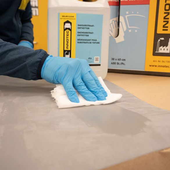 Solar Clean ist ein sehr kraftvoller Reiniger, der speziell für die schnelle und einfache Entfettung einer Vielzahl von Dachsubstraten und zu verklebenden Teilen im Photovoltaik-Bereich entwickelt wurde. Der wasserbasierte Reiniger verdunstet schnell, greift die Oberfläche nicht an und liefert ein rückstandsfreies Ergebnis.
