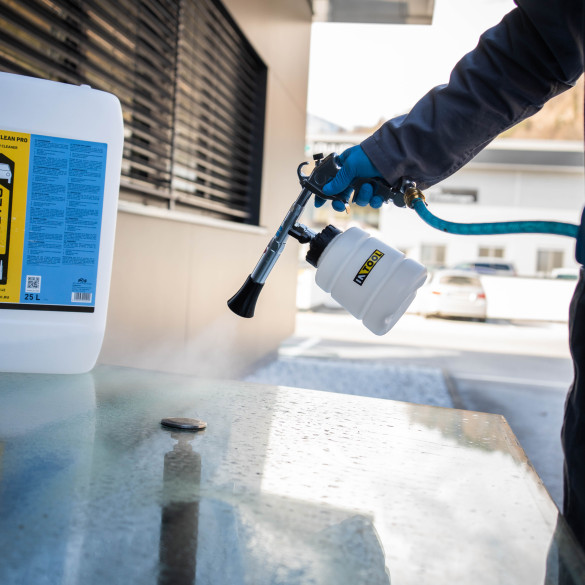 Der Turbo Spin Cleaner von INTOOL ist eine Druckluft-Reinigungspistole zur Oberflächenreinigung mit zuschaltbarer Reinigungsflüssigkeit und Umschaltung auf „air only“ zum Trocknen. Das Gerät wird nah an der Oberfläche geführt, in kreisenden Bewegungen eingesetzt und arbeitet mit Druckluft.